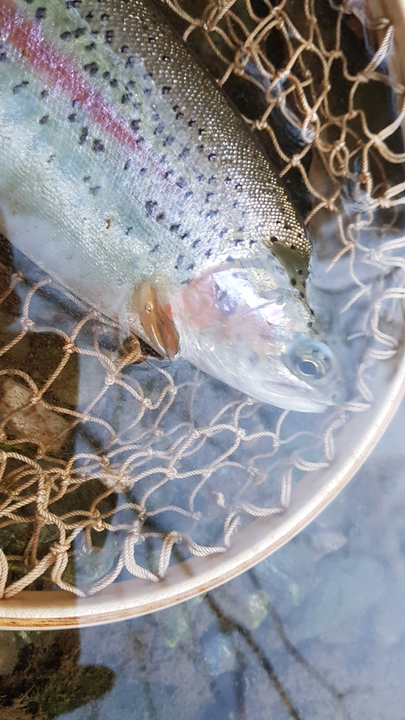 드디어 나온 송어 열심히 연습 중에 50cm 넘는 송어를 사장님이 발견해 주셨지만 결국 캐스팅에 불안정, 훅셋의 불안함으로